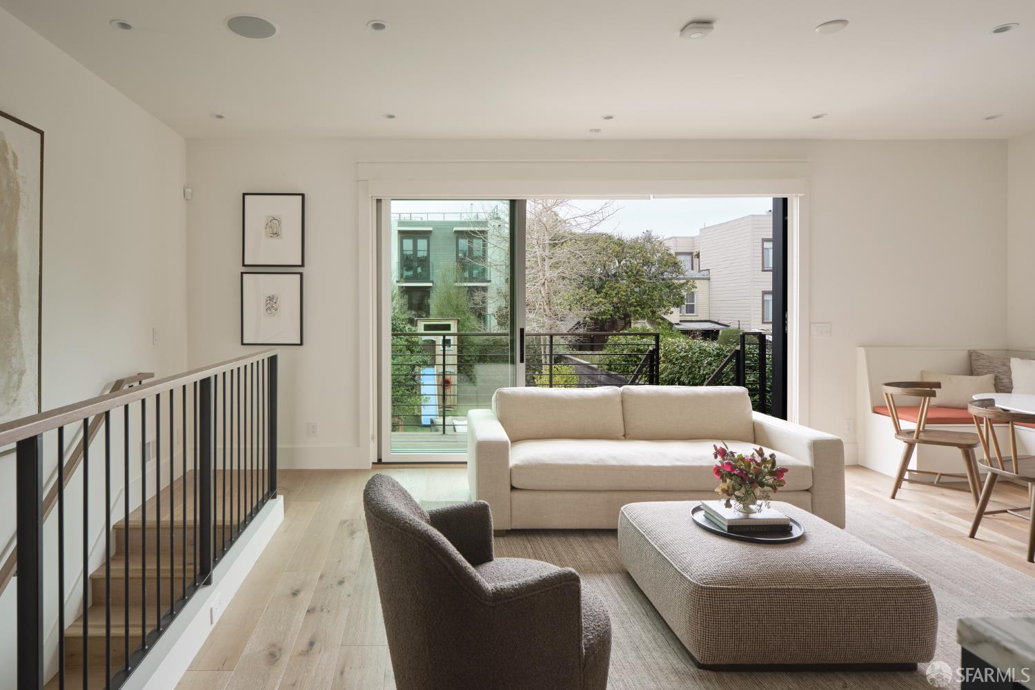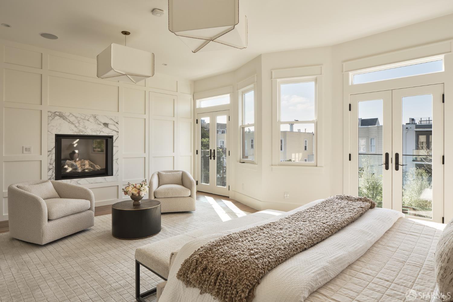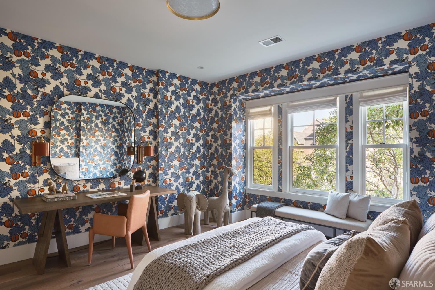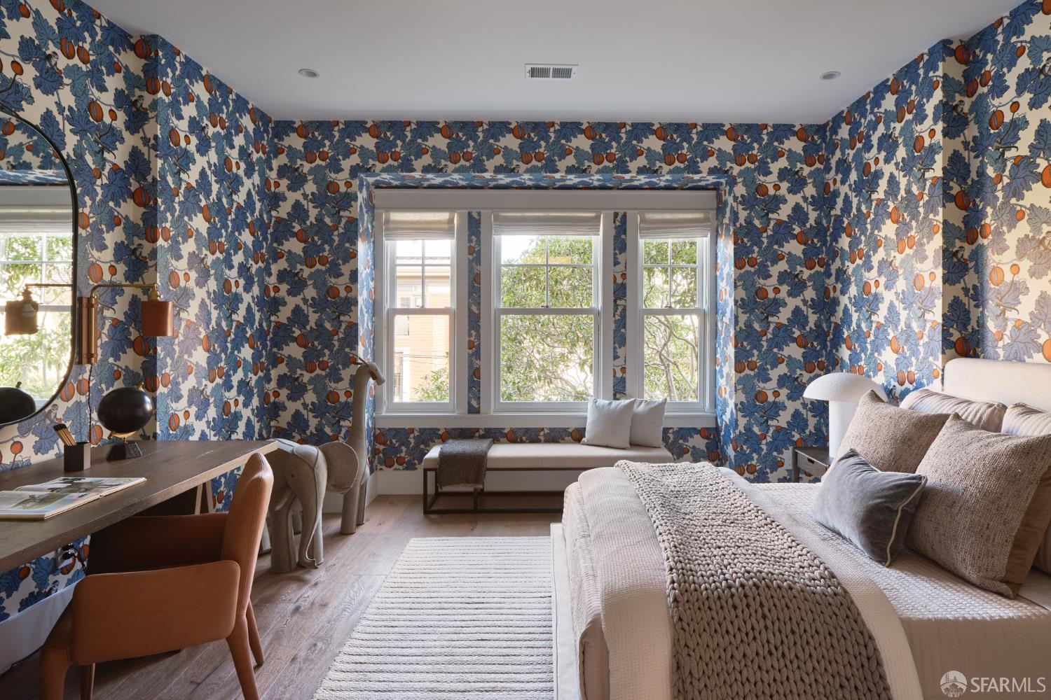 Extensively remodeled with exceptional attention to detail, this three-level residence blends timeless design with modern luxury on a quiet, tree-lined block of Lake Street near the Presidio. Wide-plank white oak hardwood floors, air conditioning, multiple skylights, and abundant natural light define the home throughout. The main level begins with a gracious formal living and dining room featuring a bay window and gas fireplace. Down the central hallway, the heart of the home unfolds into a bright, open kitchen and inviting family room. The chef's kitchen is anchored by a Calacatta marble island with counter seating and ample storage, complemented by an eye-catching backsplash, a butler's pantry, a breakfast nook with built-in seating, and a climate-controlled wine room. A disappearing floor-to-ceiling wall of glass opens to a terrace overlooking the backyard, offering generous space for entertaining, relaxation, and everyday enjoyment. An office nook and a powder room complete this level. Upstairs, a skylit landing leads to the private bedroom level. The primary suite is a serene retreat with a gas fireplace, three closets, and a beautifully appointed bath featuring a double vanity and spa-like wet room with soaking tub. Two additional bedrooms enjoy lovely light, picturesque outlooks, and a shared bath. A sun-washed roof deck provides a peaceful outdoor escape with open neighborhood outlooks. The lower level features a guest suite with an adjoining family room opening to the backyard, along with a laundry room and one-car parking with additional storage. Ideally located near the Presidio and within close proximity to the restaurants and shops along Clement St.