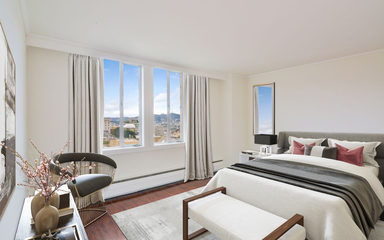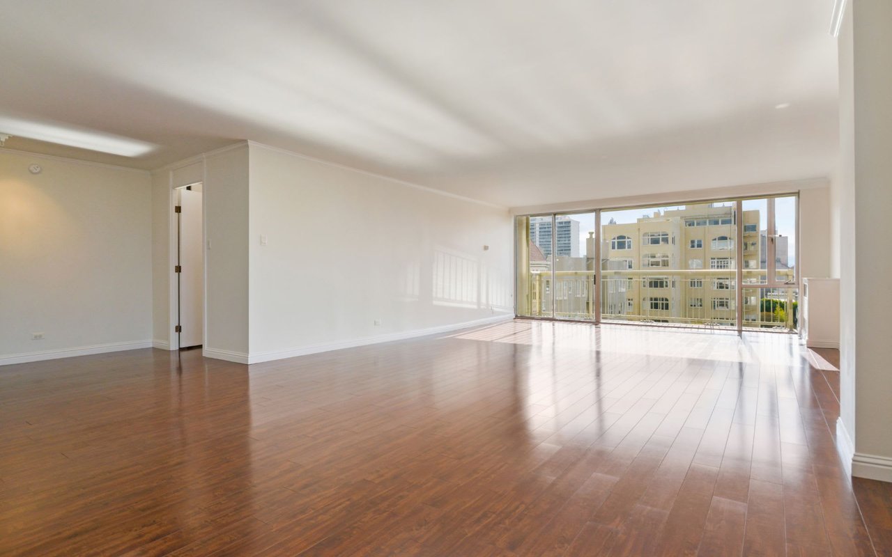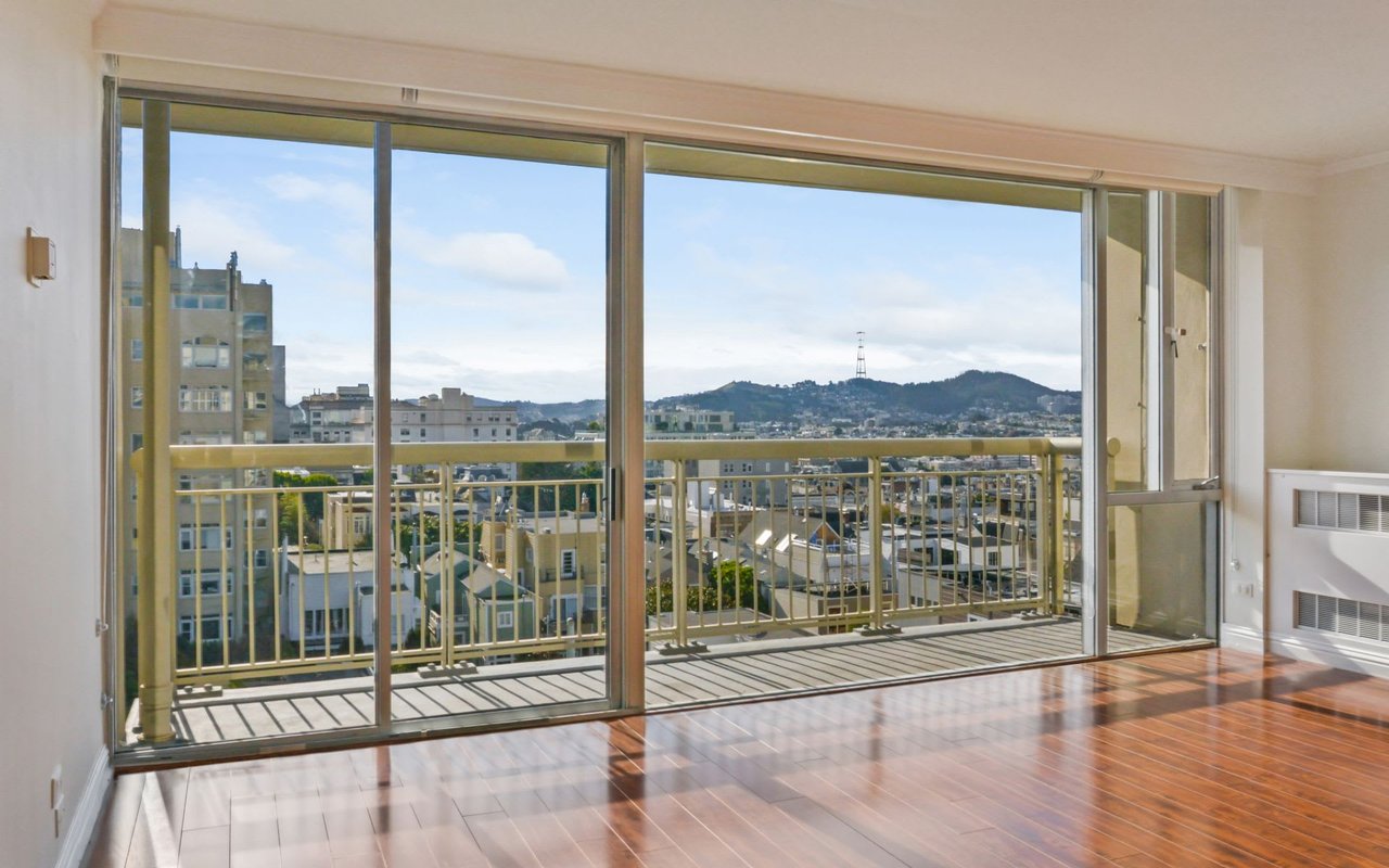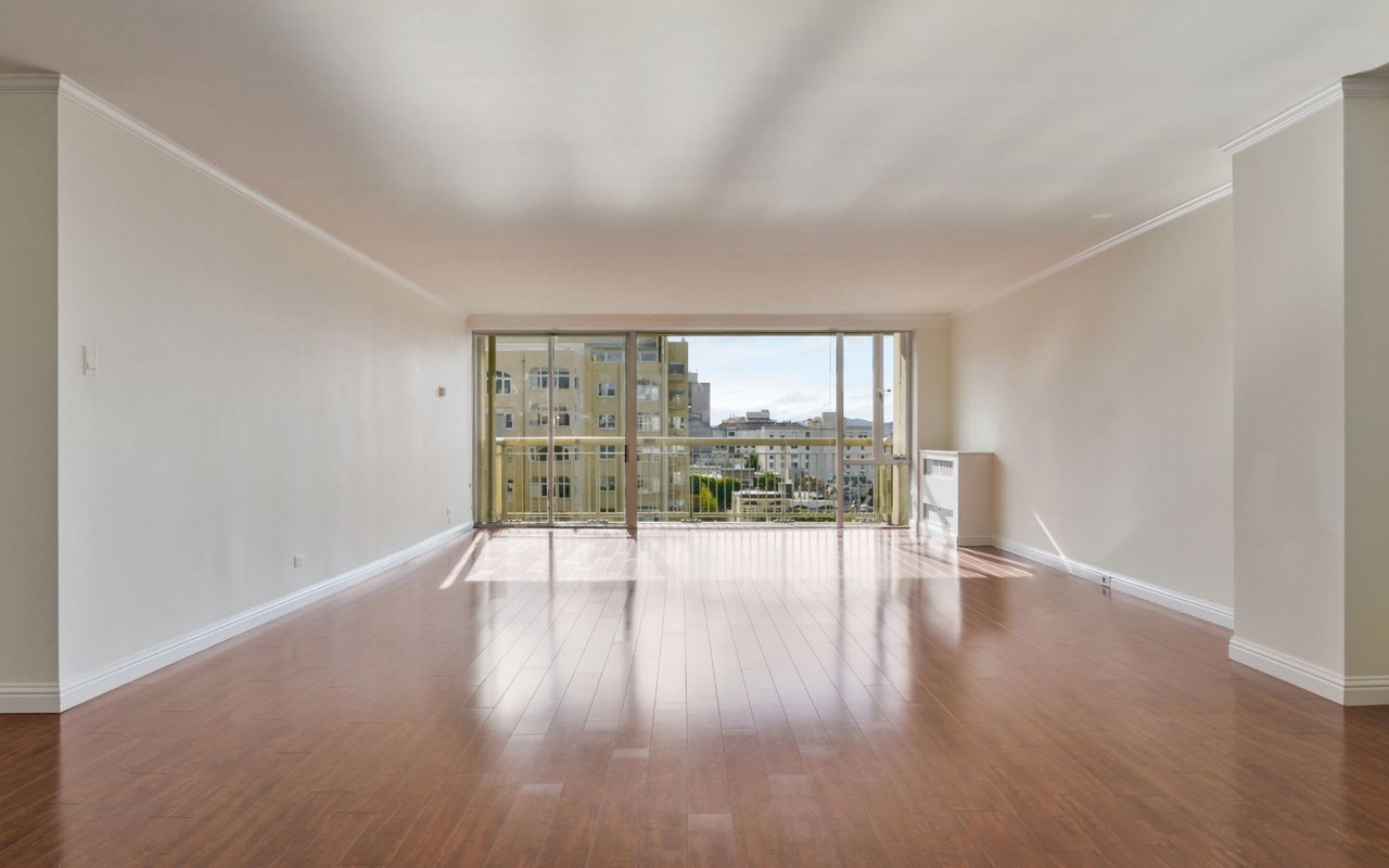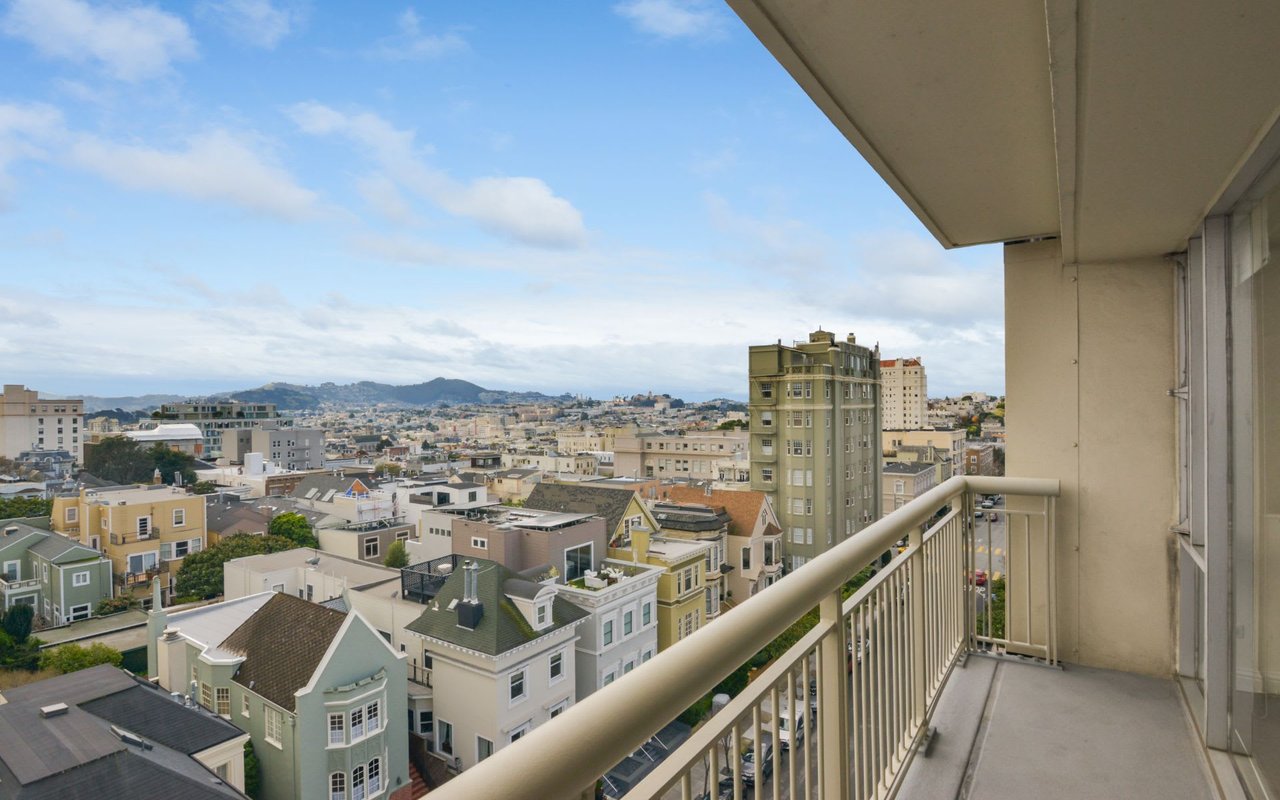 Ideally positioned in the south-west corner of the building, 2200 Pacific Ave #10F is flooded with natural light and enjoys incredible views. Details include expansive wood floors, floor-to-ceiling windows in the living room, and crown molding throughout. The large open living and dining areas offer spacious entertainment areas and create a seamless flow. Spectacular views of the Golden Gate Bridge, Twin Peaks, Sutro Tower, and St. Ignatius can be enjoyed from the living room and adjacent patio. Beyond the dining room rests the galley style kitchen, which is appointed with dual ovens, a countertop stove, stainless steel appliances, and quartz countertops. In the south-east corner of the home is the sunny master suite, complete with three closets and an en-suite bathroom that features dual sinks with a marble topped vanity, and a walk-in shower. Off of the hallway rests the second bedroom, a full bath, and linen closet. The bathroom features a marble topped vanity and a shower/tub combination enclosed in sliding glass doors.