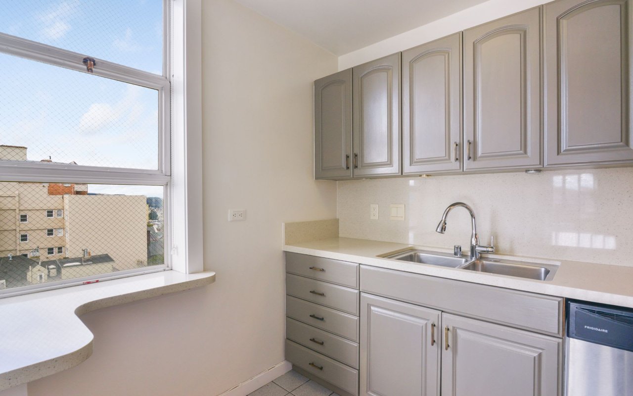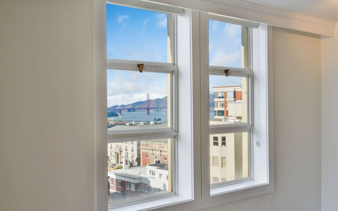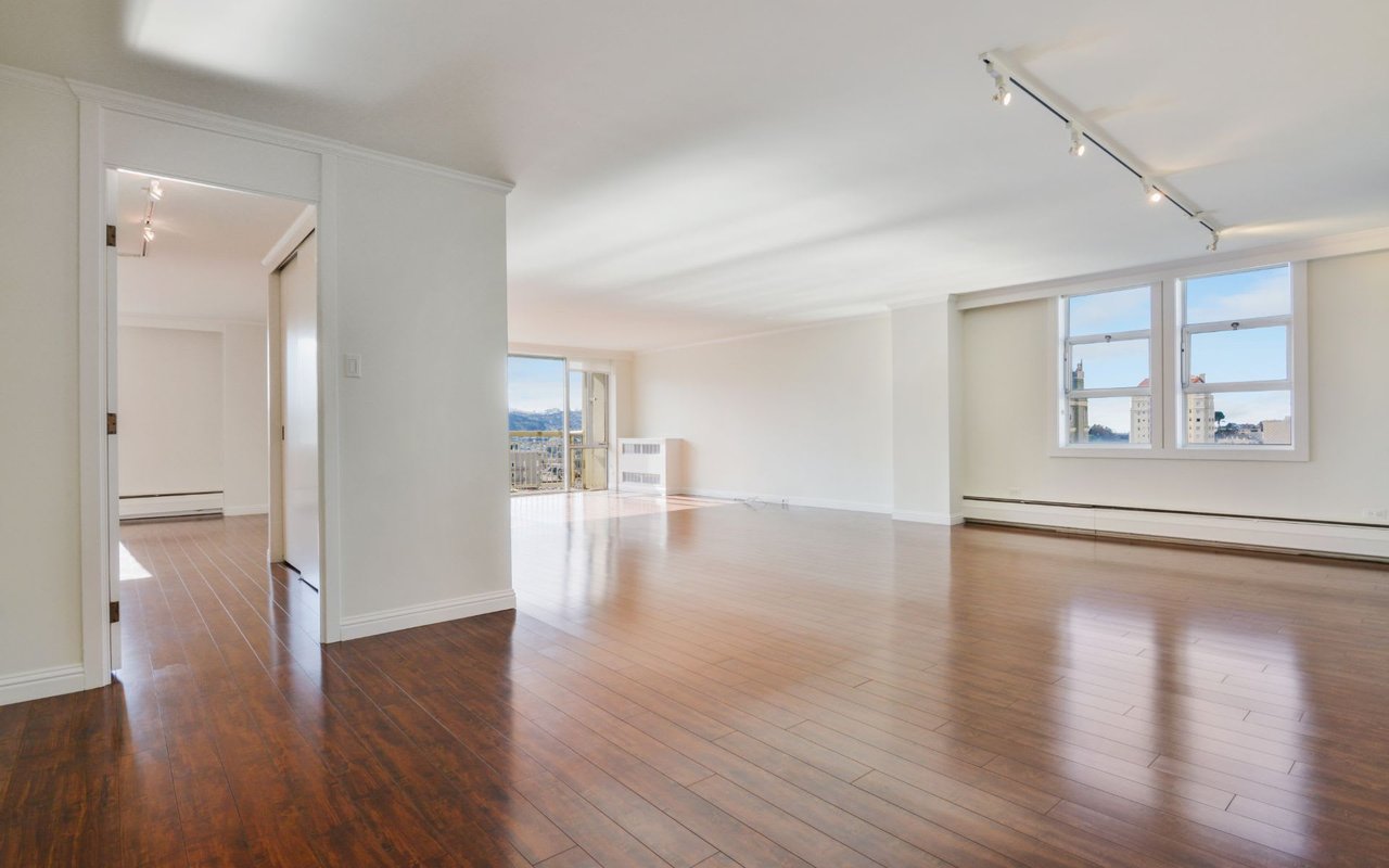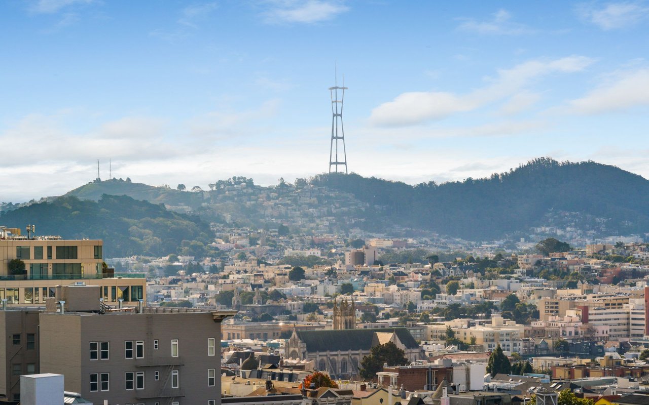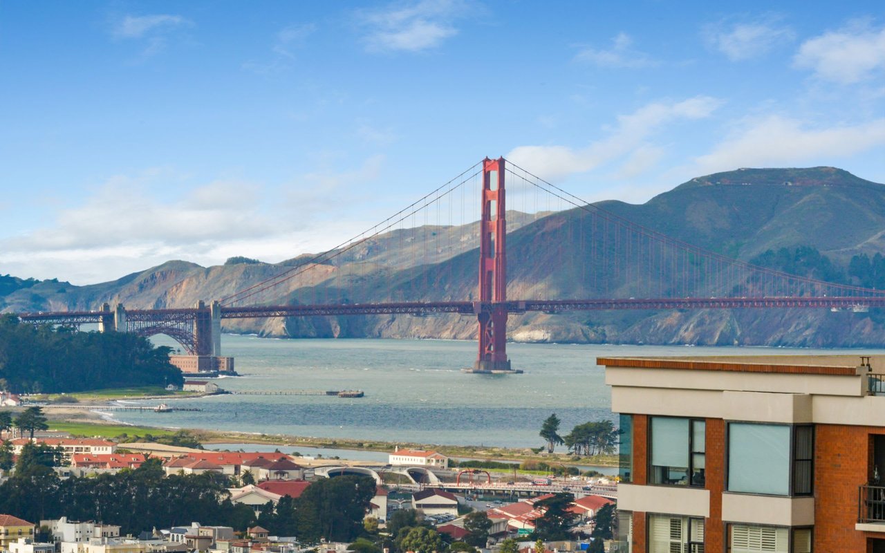 Ideally positioned in the south-west corner of the building, 2200 Pacific Ave #10F is flooded with natural light and enjoys incredible views. Details include expansive wood floors, floor-to-ceiling windows in the living room, and crown molding throughout. The large open living and dining areas offer spacious entertainment areas and create a seamless flow. Spectacular views of the Golden Gate Bridge, Twin Peaks, Sutro Tower, and St. Ignatius can be enjoyed from the living room and adjacent patio. Beyond the dining room rests the galley style kitchen, which is appointed with dual ovens, a countertop stove, stainless steel appliances, and quartz countertops. In the south-east corner of the home is the sunny master suite, complete with three closets and an en-suite bathroom that features dual sinks with a marble topped vanity, and a walk-in shower. Off of the hallway rests the second bedroom, a full bath, and linen closet. The bathroom features a marble topped vanity and a shower/tub combination enclosed in sliding glass doors.