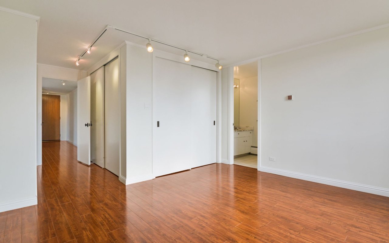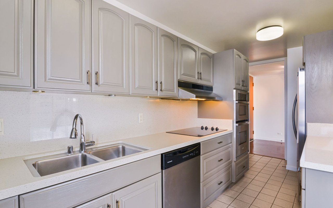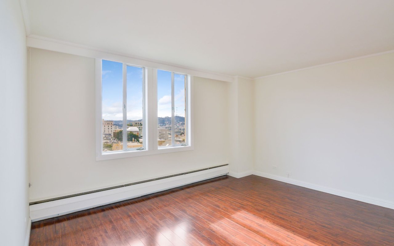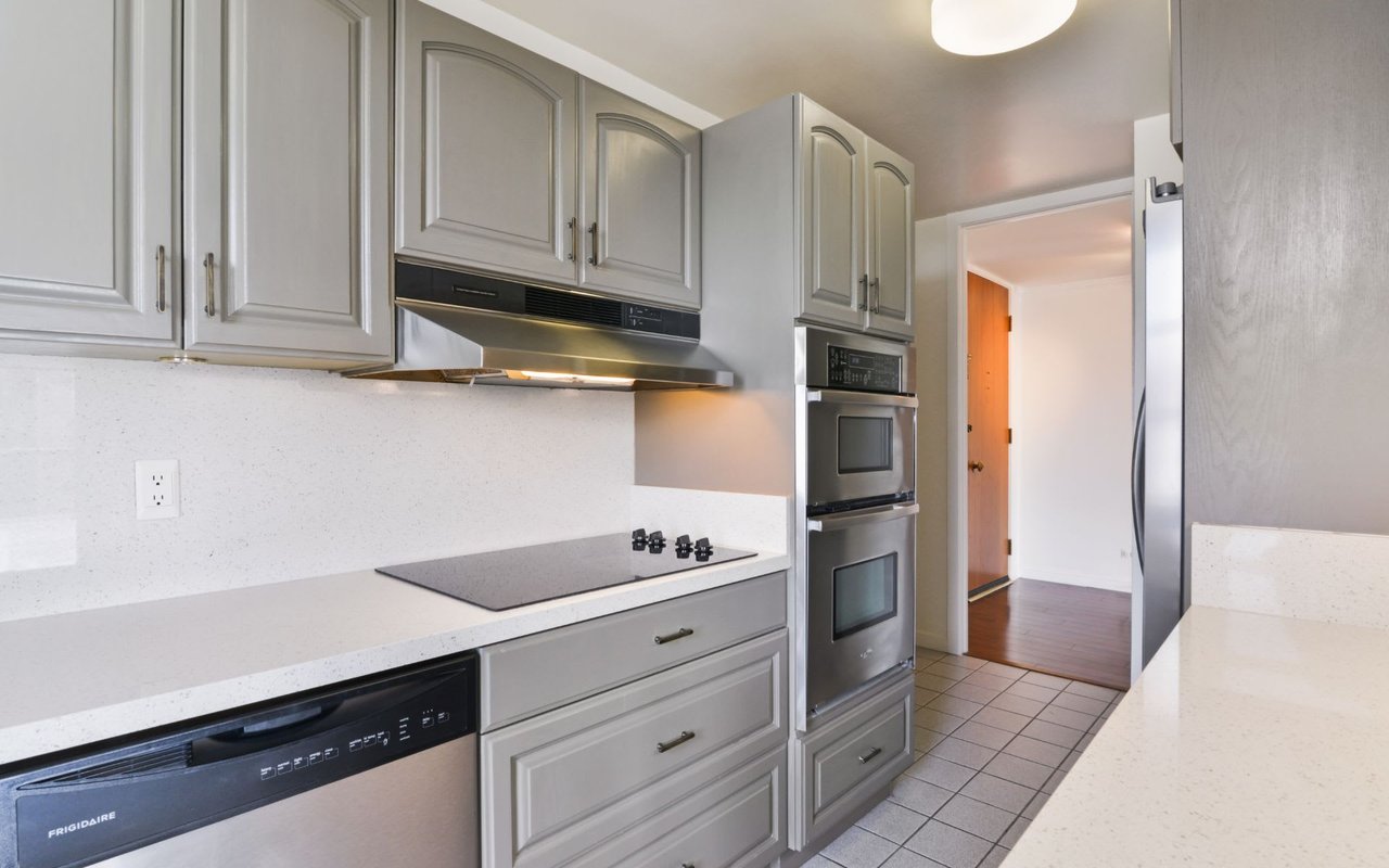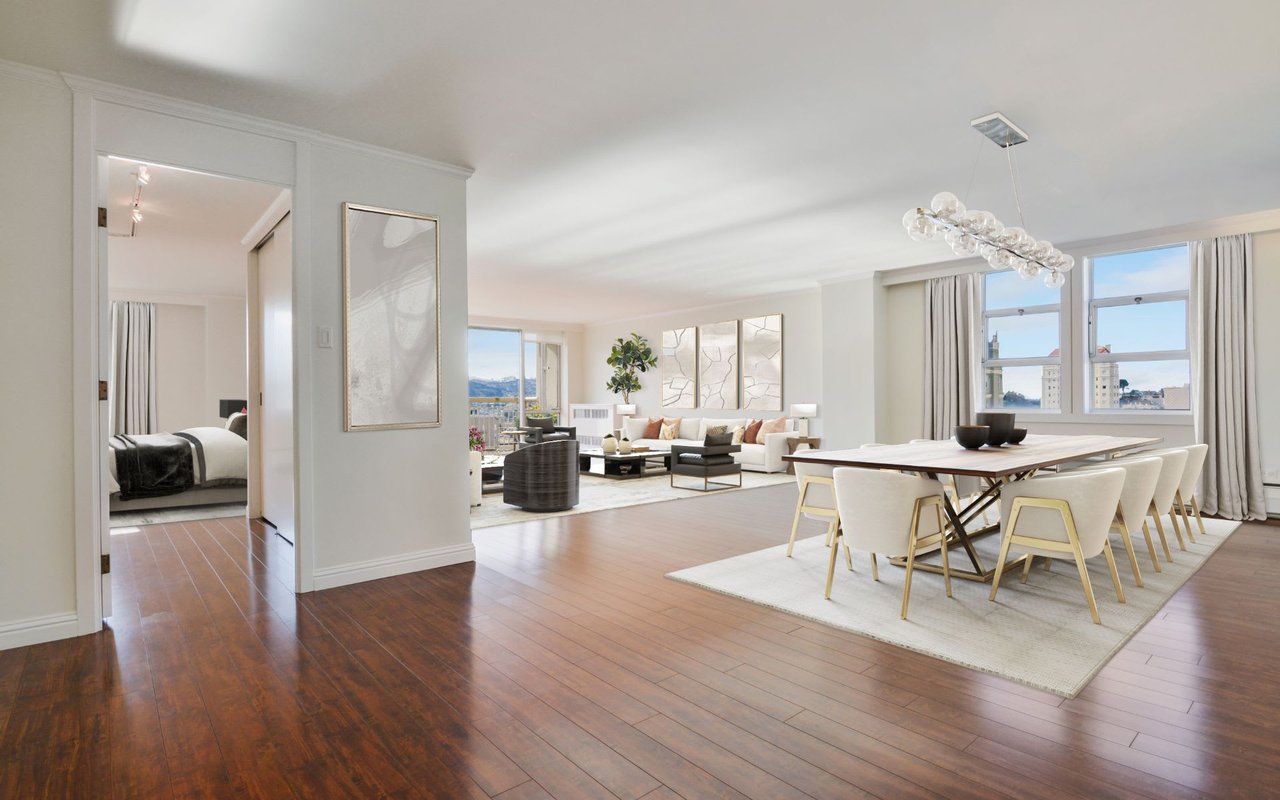 Ideally positioned in the south-west corner of the building, 2200 Pacific Ave #10F is flooded with natural light and enjoys incredible views. Details include expansive wood floors, floor-to-ceiling windows in the living room, and crown molding throughout. The large open living and dining areas offer spacious entertainment areas and create a seamless flow. Spectacular views of the Golden Gate Bridge, Twin Peaks, Sutro Tower, and St. Ignatius can be enjoyed from the living room and adjacent patio. Beyond the dining room rests the galley style kitchen, which is appointed with dual ovens, a countertop stove, stainless steel appliances, and quartz countertops. In the south-east corner of the home is the sunny master suite, complete with three closets and an en-suite bathroom that features dual sinks with a marble topped vanity, and a walk-in shower. Off of the hallway rests the second bedroom, a full bath, and linen closet. The bathroom features a marble topped vanity and a shower/tub combination enclosed in sliding glass doors.