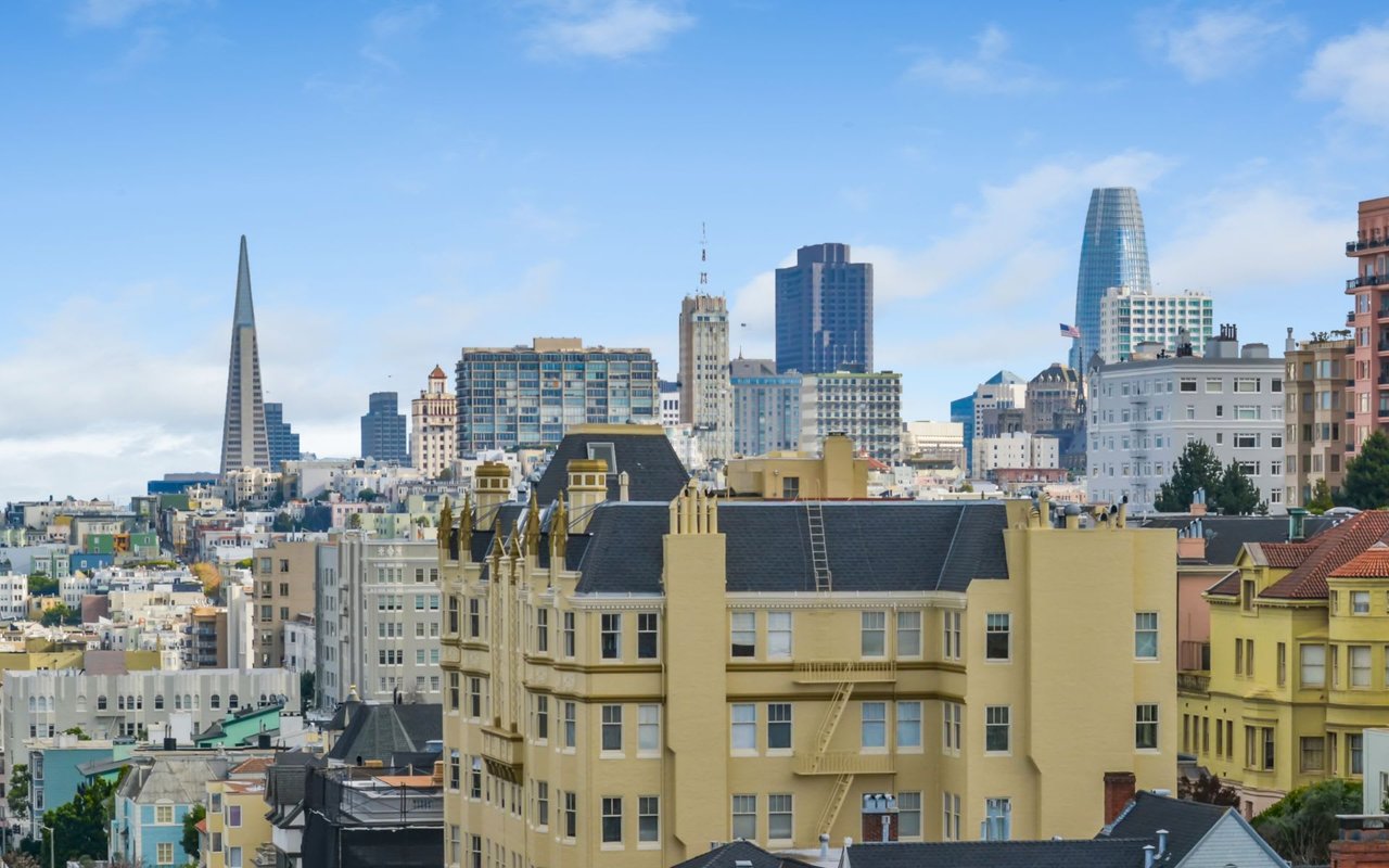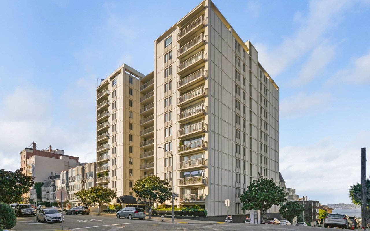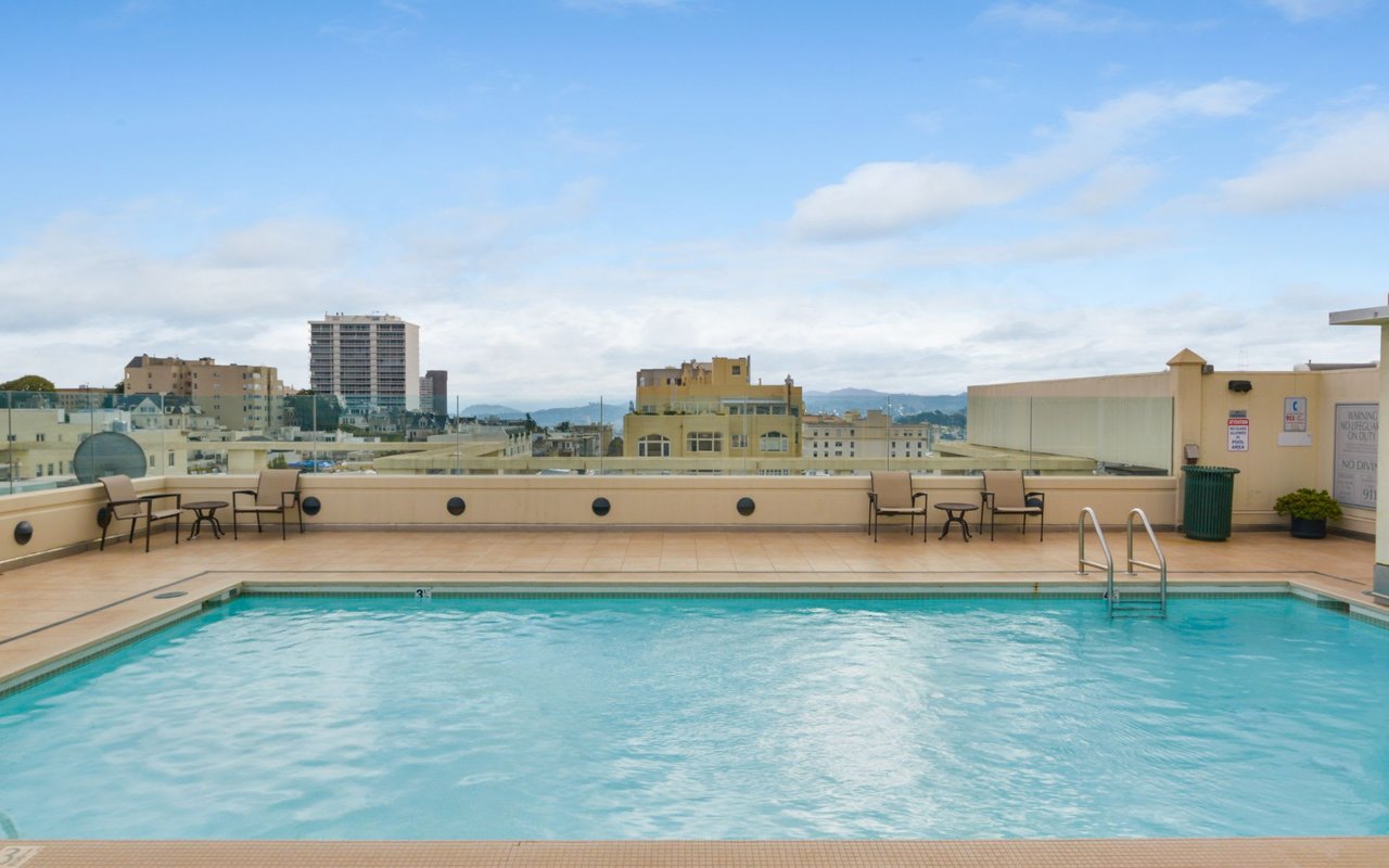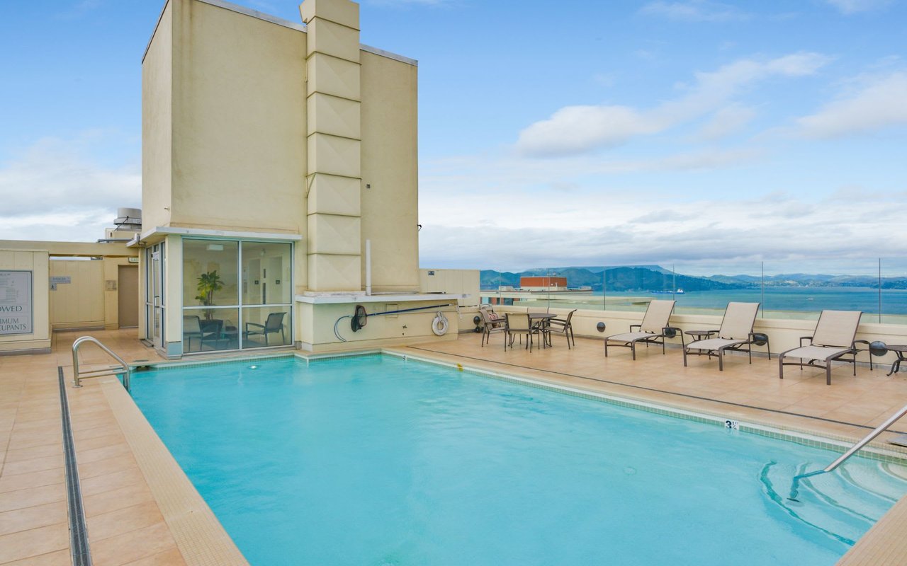 2200 Pacific Ave is a classic mid-century amenity condo building, constructed in 1962. Amenities include a 24/hour attended lobby, a roof top heated pool and lounge space with panoramic views of the Golden Gate Bridge, Alcatraz, and downtown San Francisco, and a shared laundry room. The residence includes a parking space and private storage unit.