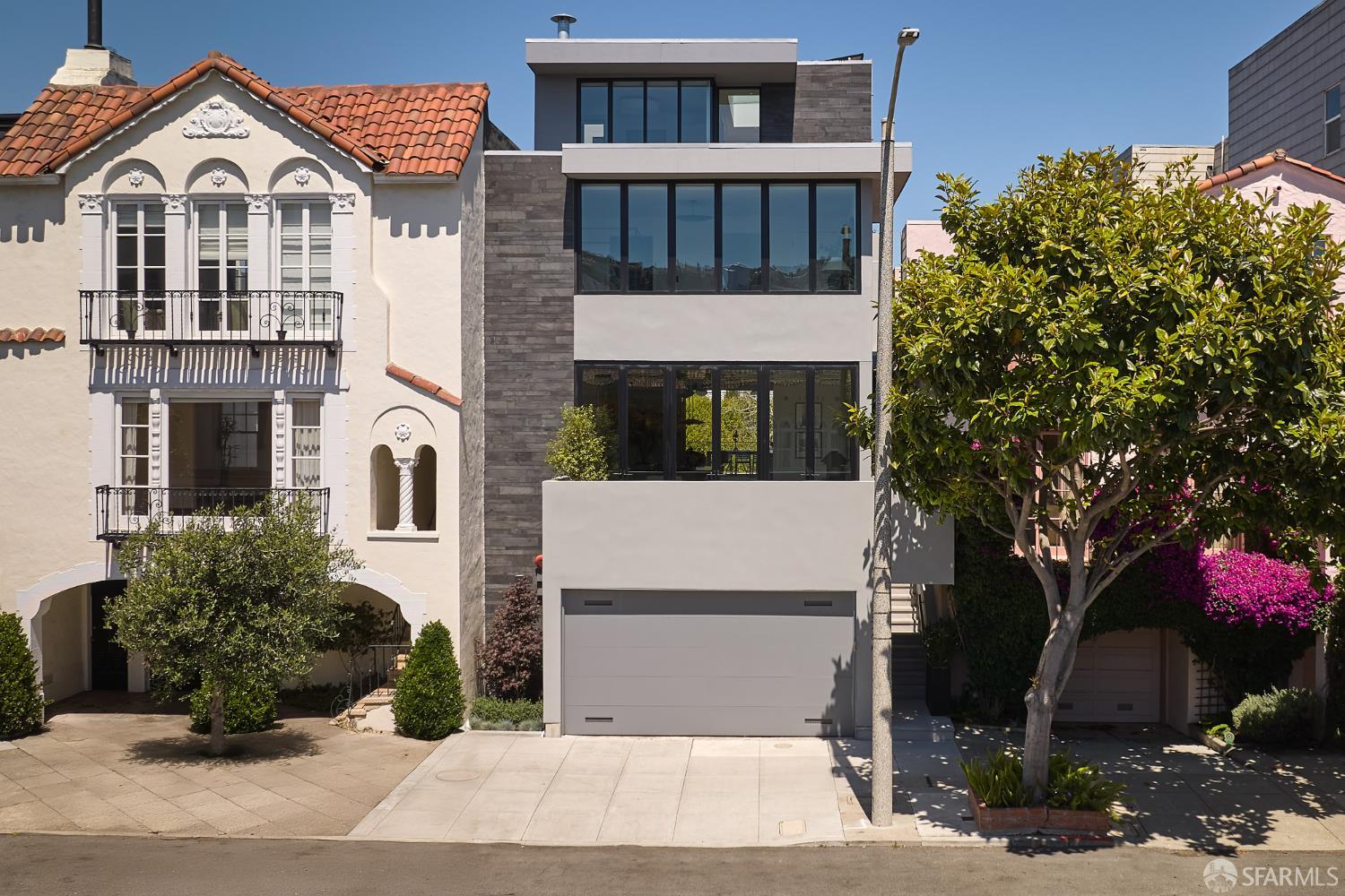 This four-level contemporary residence designed with superior style and systems enjoys a coveted location in the Marina on a quiet block near Chestnut St. The light-filled living room features wide-plank white oak floors, a gas fireplace, and a sunny south-facing wall of windows accessing an inviting balcony. Flowing effortlessly from this space are a dining room with a built-in buffet and a discreet powder room. Beyond is a kitchen with an island, a hidden wet bar, a cheerful family room, and glass doors opening to a deck with a built-in BBQ and stairs to the backyard. Both an elevator and a striking modern stairway lead to the level above, where the principal suite enjoys views towards Pacific Heights and a spa-inspired ensuite bath with a walk-in closet. Two guest bedrooms overlook the backyard; each with an ensuite bath. Crowned by an oversized skylight, the uppermost level offers an additional bedroom, a stylish hall bath, and a family room with a wall of glass giving way to a large, sunny terrace with a picturesque vista of the Palace of Fine Arts and Golden Gate Bridge. In addition to a 2-car garage, the lower-level features a mudroom, wine cellar, home office, full bath, and a media room with a wall of sliding glass doors that gives way to a patio & the vibrant backyard.